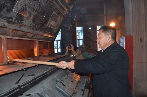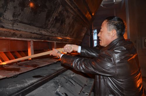 (城發公司副總經理梁永慶,手持火把密切關注爐膛內火焰燃燒的態勢。李波攝)