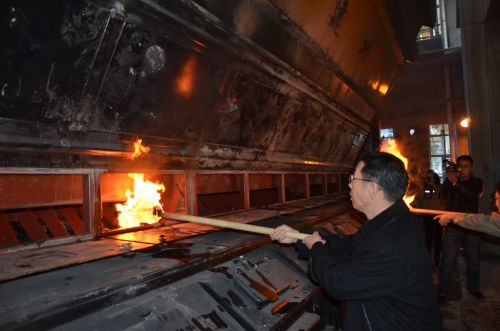 (城發公司副總經理史繼文將熊熊燃燒的火把放入爐內,