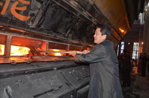 (城發公司副書記張永將點火火把放入1號鍋爐爐膛。李波攝)