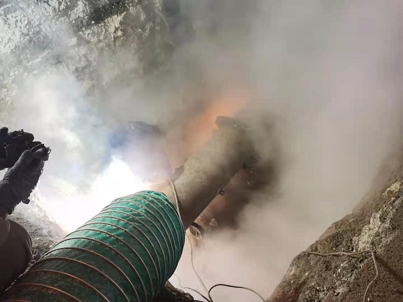 據悉,此次堵漏是將DN400的鋼管,上下一分為二,分為兩片,下面的部分加裝泄水閥,然后將上下合攏把原管道扣在里面,兩端用鋼板做內徑250和外徑400的擋板,將泄露段整體包封在里面。水流從下部泄水閥泄走,不影響焊接,在整體焊接完,關閉泄水閥。