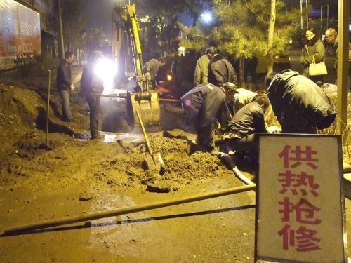 工作人員兵分幾路,對一次網和熱力站進行泄水,同時在跑水地點進行開挖,并將水抽干,待破損管網露出后,按預定技術方案進行更換和焊接。時值入冬,夜間溫度已在零下,相關領導及搶修人員一直在現場工作,無人休息,毫無怨言在寒風中工作人員咬緊牙關,爭分奪秒,連續奮戰了10多個小時,終于在第二日凌晨7時,成功將跑水事故處理完畢,并于12時恢復了熱力站正常運行。