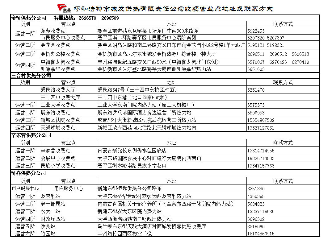 城發(fā)供熱公司收費(fèi)營(yíng)業(yè)點(diǎn)地址及聯(lián)系方式